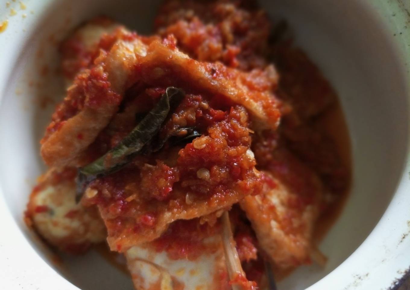 - Haluskan bumbu. Panaskan minyak. Tumis bumbu, serai, lengkuas,daun jeruk hingga harum. Tambahkan sedikit air, gula merah, garam, penyedap rasa. Aduk hingga mengental. Masukkan tahu dan telur. Lalu aduk kembali hingga matang merata. Cek rasa. Angkat. Sajikan.