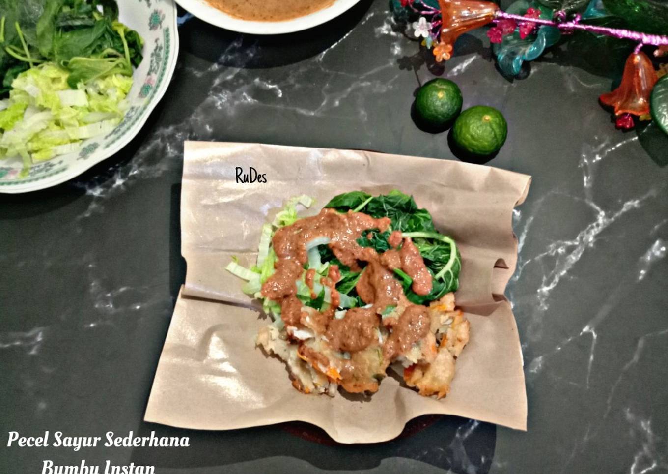 - Siapkan bumbu pecel, seduh dengan air panas, aduk² hingga bumbu larut. Tambahkan jeruk limo. Susun sayuran pada piring.