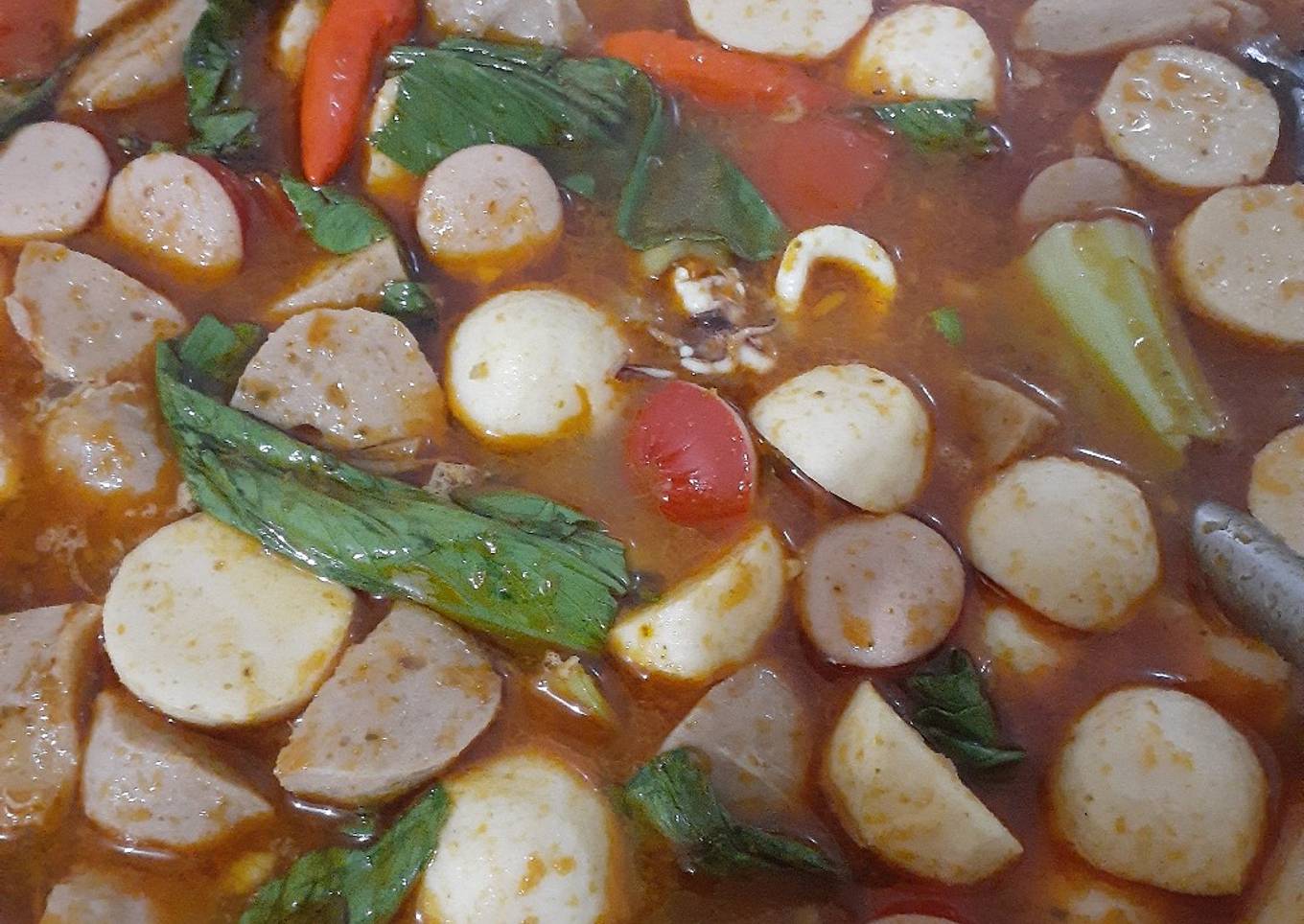 - Setelah airnya mendidih masukkan baso sapi, baso ikan, cumi, sosis sapi masak kurang lebih 2 menit masukkan pakcoi. Cek rasa kalau kurang pas boleh tambahkan kaldu jamur