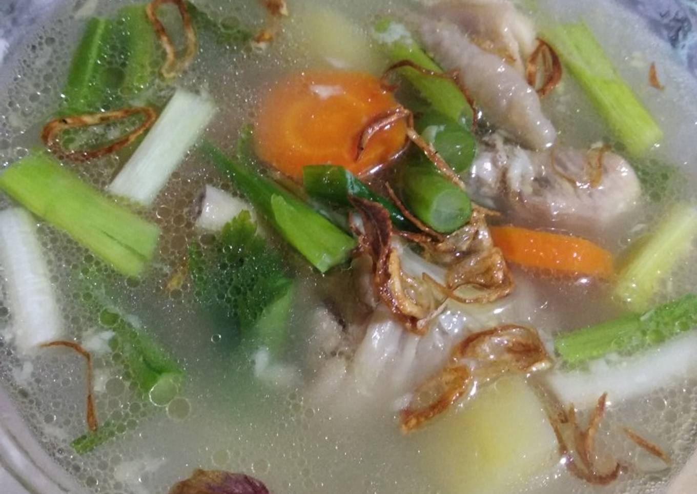 - Setelah mendidih masukkan wortel dan buncis, setelan agak matang masukkan daun bawang dan daun seledri. Tambahkan garam, koreksi rasa. Jika sudah pas matikan kompor dan taburi dg bawang goreng
