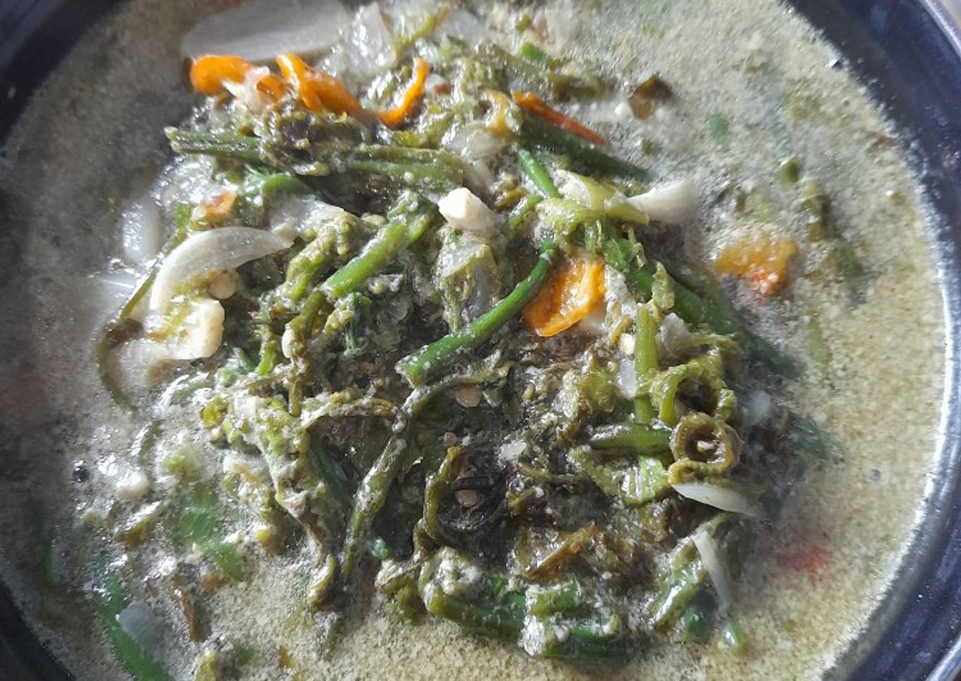 - Setelah itu campurkan pakis, aduk2, masak hingga pakis layu, lalu tambahkan garam, lada, gula dan kaldu bubuk. Koreksi rasa. Lalu tambahkan santan. Masak hingga santan meresap.