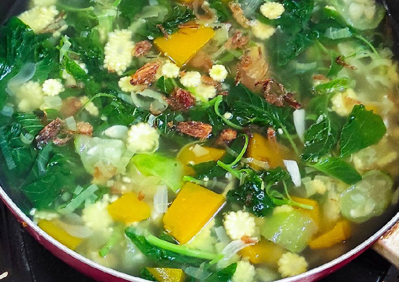 - Rebus air sampai mendidih. Masukkan bumbu iris, kemudian gambas, utren dan labu. Masak sampai setengah matang. Bumbui dengan garam gula dan kaldu jamur. jangan lupa cek rasa ya Moms :)