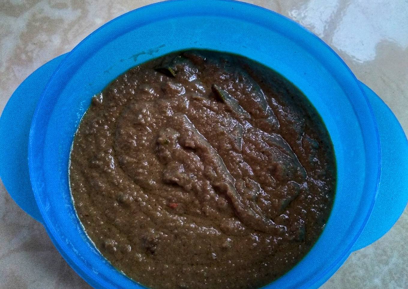 Lalu tuang ke wajan masukan daun jeruk.gula garam terasi masak hingga air menyusut dan kental lalu icip jika di rasa gurih manis pedas kurang pas bisa di tambahkan apa yg kurang..