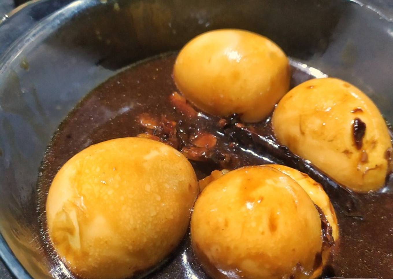 - Masukkan telur rebus, koreksi rasa dan aduk sampai kuah mengental dan meresap. Kecilkan api. Taburi potongan daun bawang. Aduk rata. Matikan api.