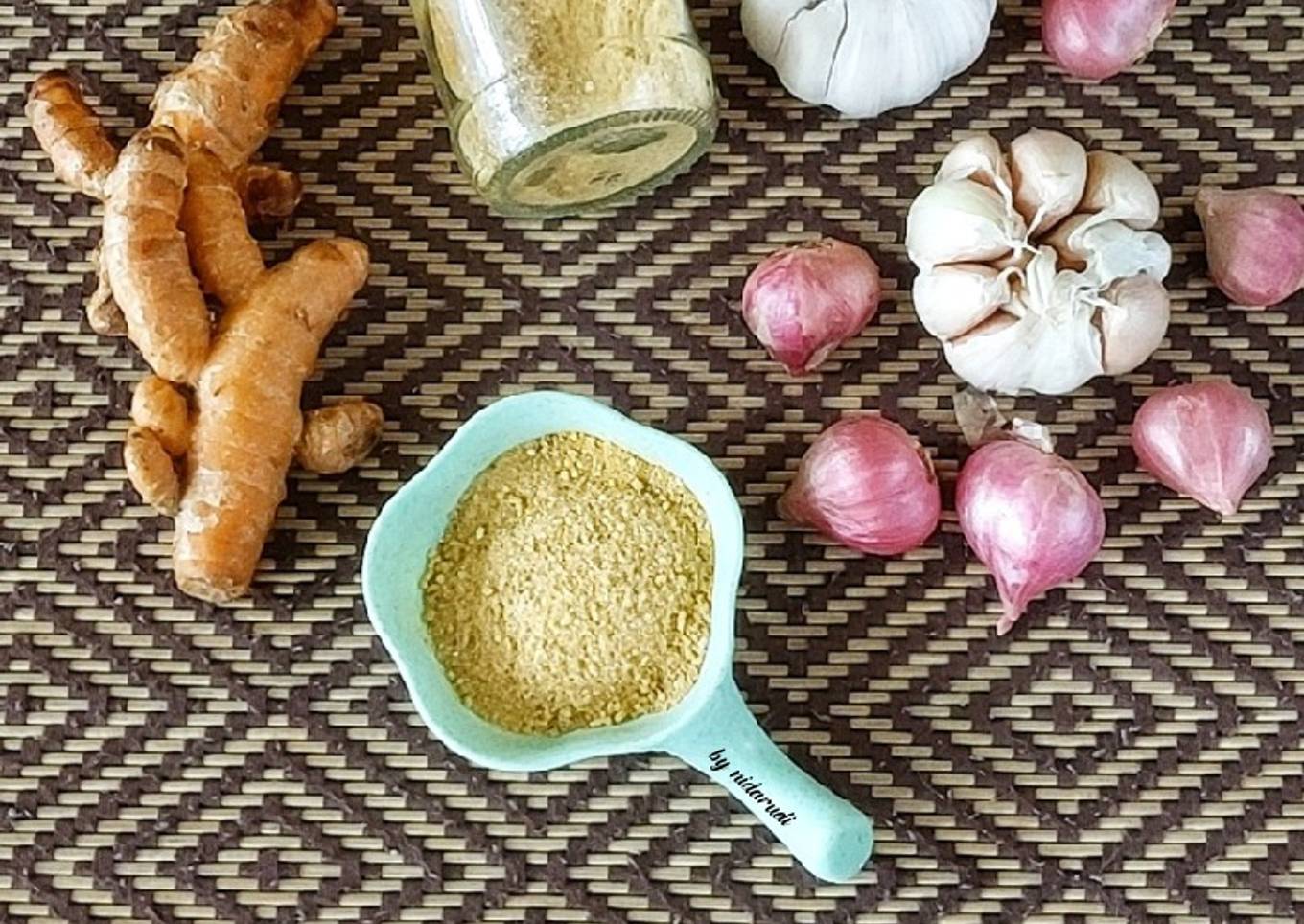 - Dalam wadah, campur bubuk bawang putih, ketumbar, kunyit dan kaldu jamur. Aduk sampai rata.