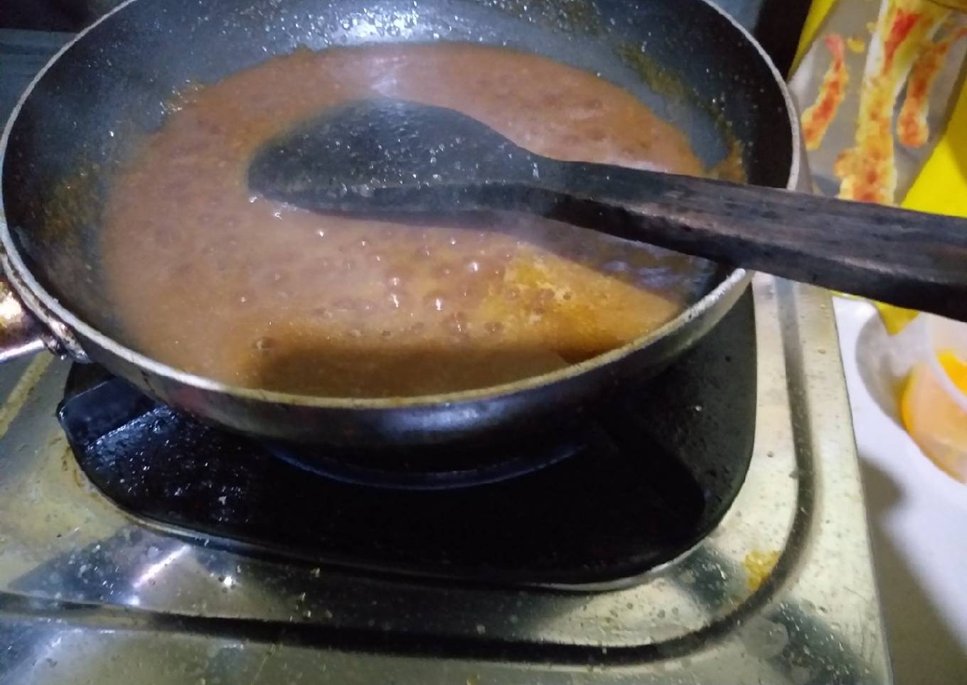 - Panaskan margarin, tumis bumbu hingga harum, tambahkan kecap, gula, garam, lada, kaldu jamur dan air, masak hingga meletup dan mengental dan angkat