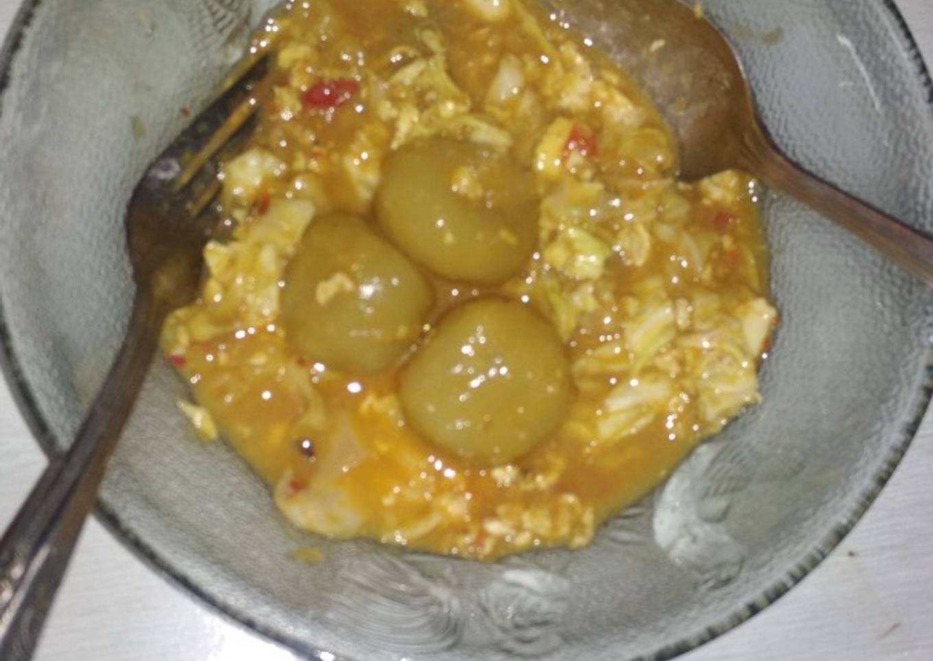 bawang merah, putih, cabai, lada, kencur. - Orek telur, kemudian tumis bumbu setelah harum, tambahkan kecap, kaldu jamur lalu masukkan air