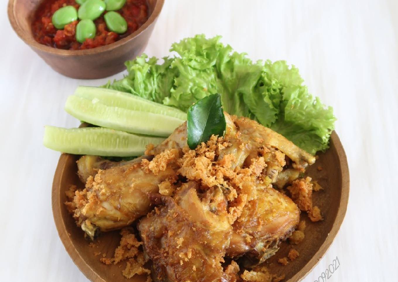 - Tiriskan ayam, kemudian goreng dalam minyak panas sampai kecoklatan, sebentar saja. Tiriskan. Sajikan bersama lalapan, sambal, dan nasi hangat.