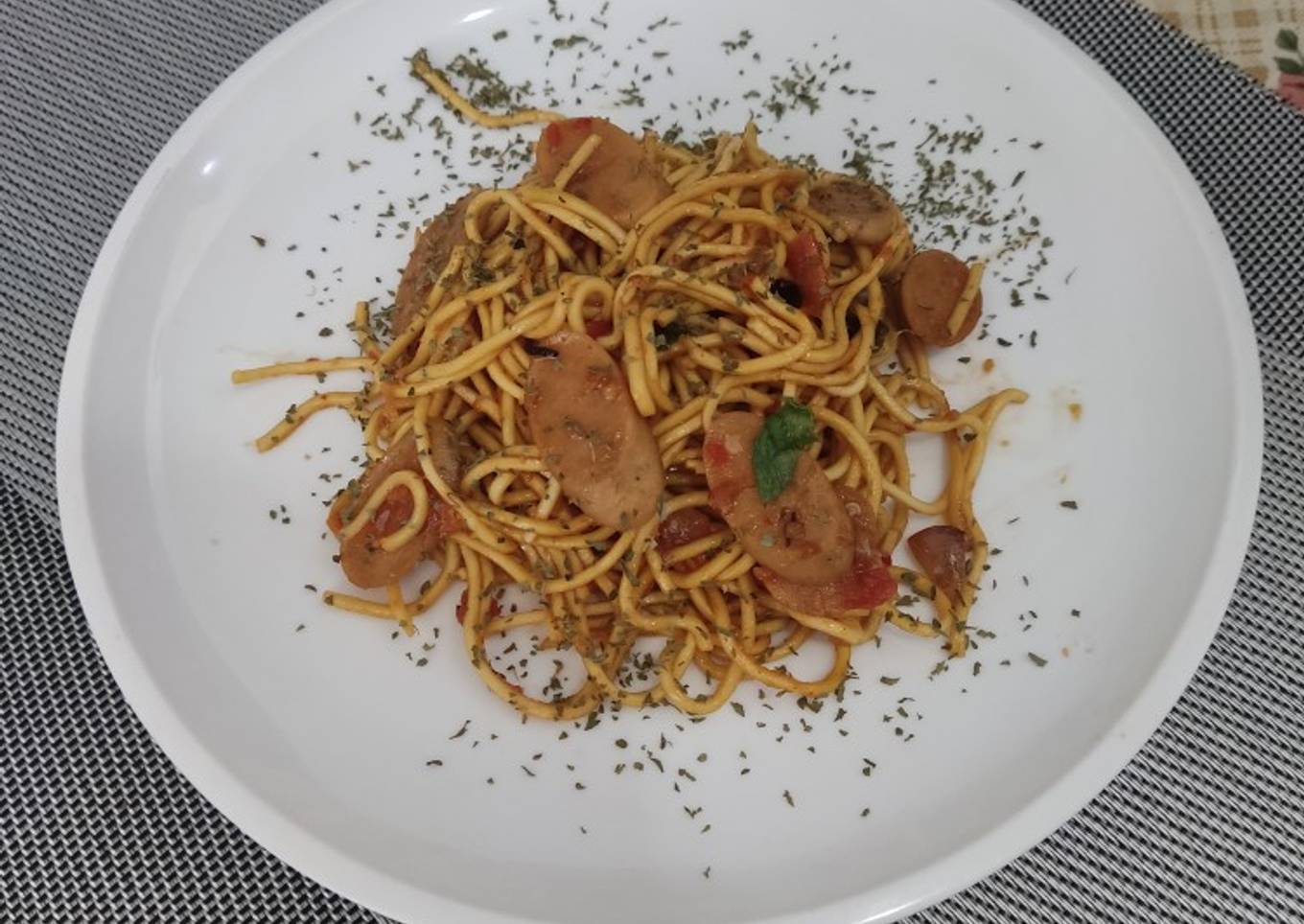 - Masukkan sosis, tambahkan sedikit air, aduk rata.