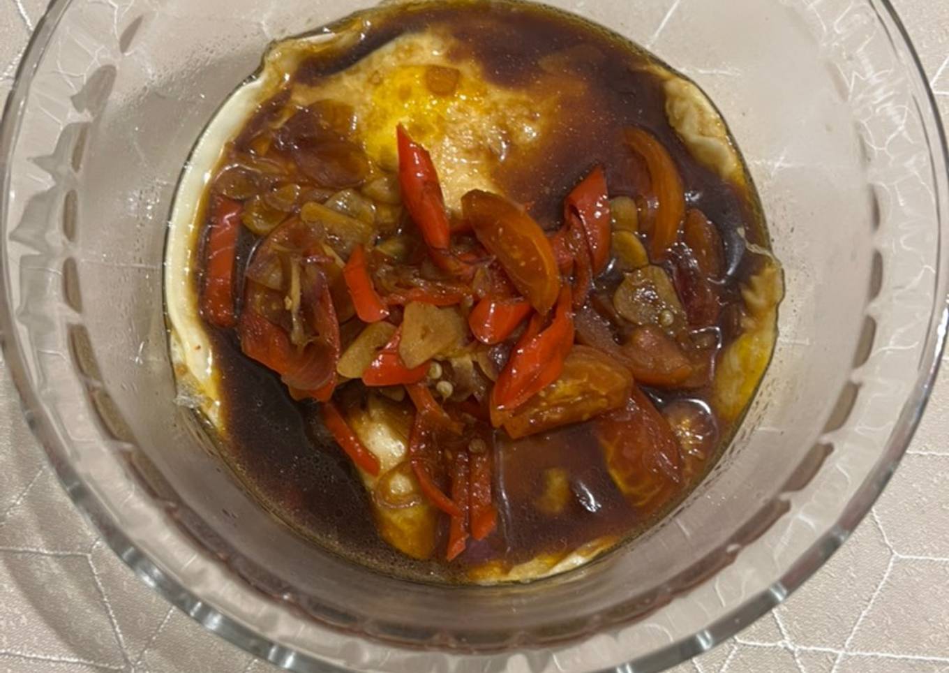 - Siram bumbu tadi keatas telur ceplok.