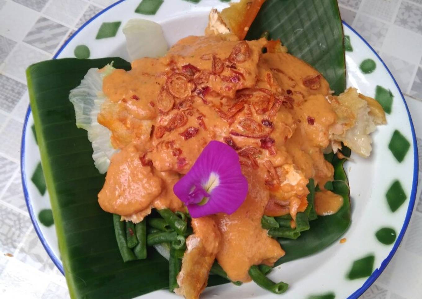 - Tata sayuran dalam piring, beri toping tempe goreng/bakwan sesuai selera. Siram dengan bumbu kacang dan taburi dengan bawang goreng.