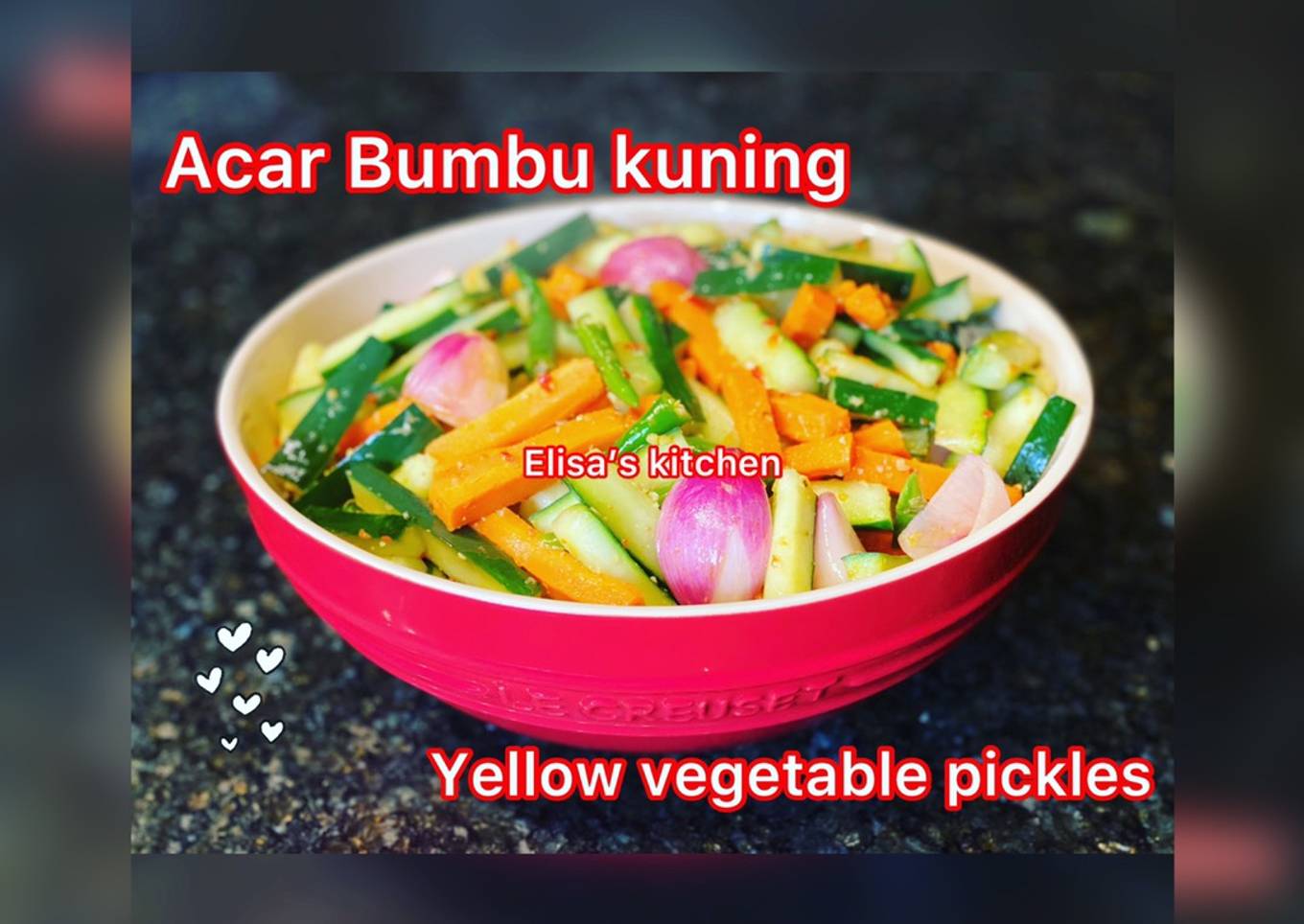 Banyak hal yang sedikit banyak berpengaruh terhadap kualitas rasa dari Acar Bumbu kuning, pertama dari jenis bahan, kemudian pemilihan bahan segar, hingga cara mengolah dan menghidangkannya. Tidak usah pusing jika hendak menyiapkan Acar Bumbu kuning yang enak di rumah, karena asal sudah tahu triknya maka hidangan ini bisa jadi suguhan istimewa. Next adalah gambar mengenai Acar Bumbu kuning yang bisa Anda jadikan ide.